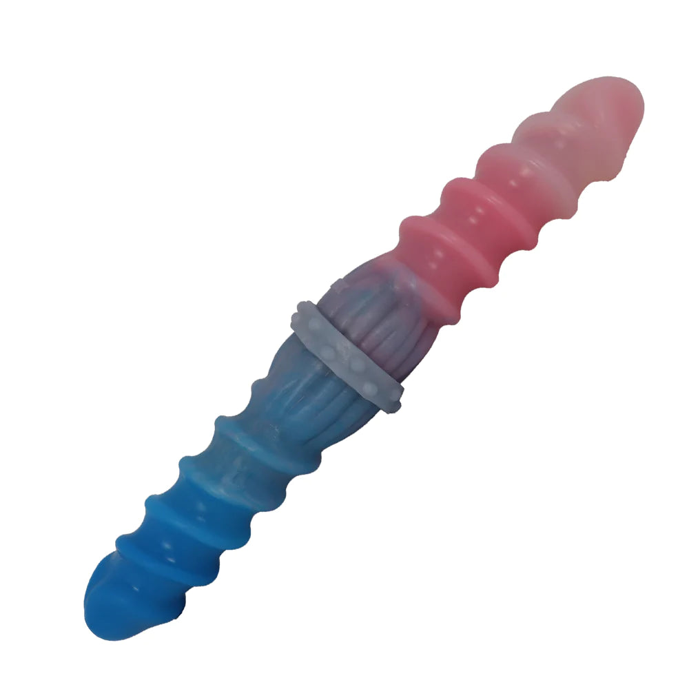 The Corkscrew Double Ended Dildo is a part of our Shared Pleasure collection. Coloured in blue and pink, this double ended dildo is designed to be shared with a partner. Both shafts feature deep, spiralled ribbing to enhance your experience. With this dildo, you can physically connect with a partner and share intimate pleasure with them.