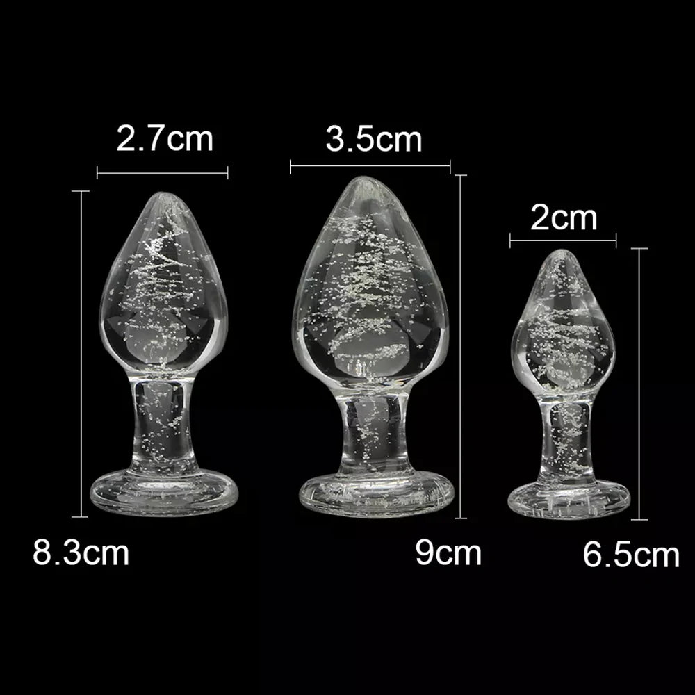 The Glowing Glass Butt Plug Set is a part of our Crystal Clear collection. Made with transparent glass, this set of plugs contain glow in the dark specks to light up your sex life. With these butt plugs, you can enjoy the hardness that only glass toys can provide.